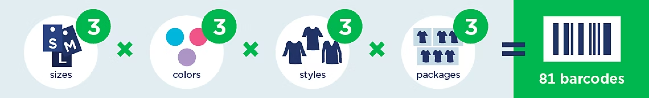 3 sizes x 3 colors x 3 styles x 3 packages = 81 barcodes